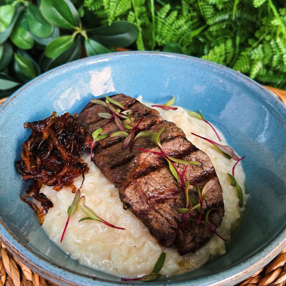 Escalopinhos de *filé mignon (aprox. 130g) com risoto de parmesão e cebola caramelizada. *servido no ponto da casa, não fazemos alteração.