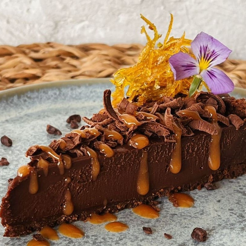 Irresistível torta de ganache de chocolate meio amargo com nibs de cacau. Sua base fina de biscoito de chocolate proporciona o toque perfeito, enquanto fios de caramelo toffee, raspas de laranja caramelizadas e um leve toque de flor de sal finalizam a sobremesa com um sabor marcante. Uma experiência única e sofisticada para os amantes de chocolate!