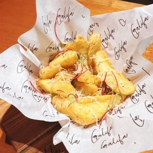 Batatas rústicas finalizadas com salsa tartufata italiana, alecrim , parmesão e flor de sal.