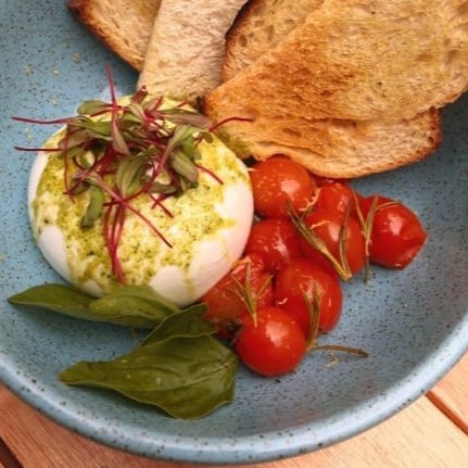 Burrata artesanal e cremosa acompanhada de molho pesto, tomatinhos confit, finalizada com raspas de limão siciliano e flor de sal. Acompanha pão levain (de fermentação natural).