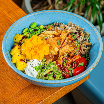Mix de Cogumelos, creme de avocado, cream cheese, edamame, tomate cereja, manga, chips de batata doce e base de shari (arroz japonês para sushi temperado artesanalmente), finalizado com raspas de limão siciliano, gergelim e cebolinha. Escolha seu molho favorito (tarê ou teriyaki) para acompanhar!