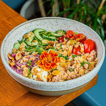 Salmão grelhado desfiado, cream cheese, pepino japonês, tomate cereja, picles de cebola roxa e base de shari (arroz japonês para sushi temperado artesanalmente), finalizado com lâminas de amêndoas, gergelim e cebolinha. Escolha seu molho favorito (tarê ou teriyaki) para acompanhar!