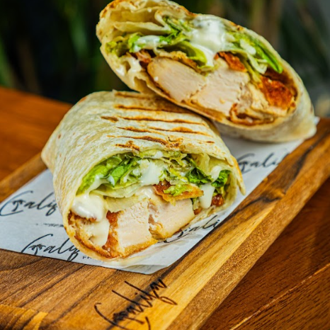 Frango empanado, molho caesar, parmesão e mix de folhas americana e romana, envoltos em wrap tradicional e prensado.