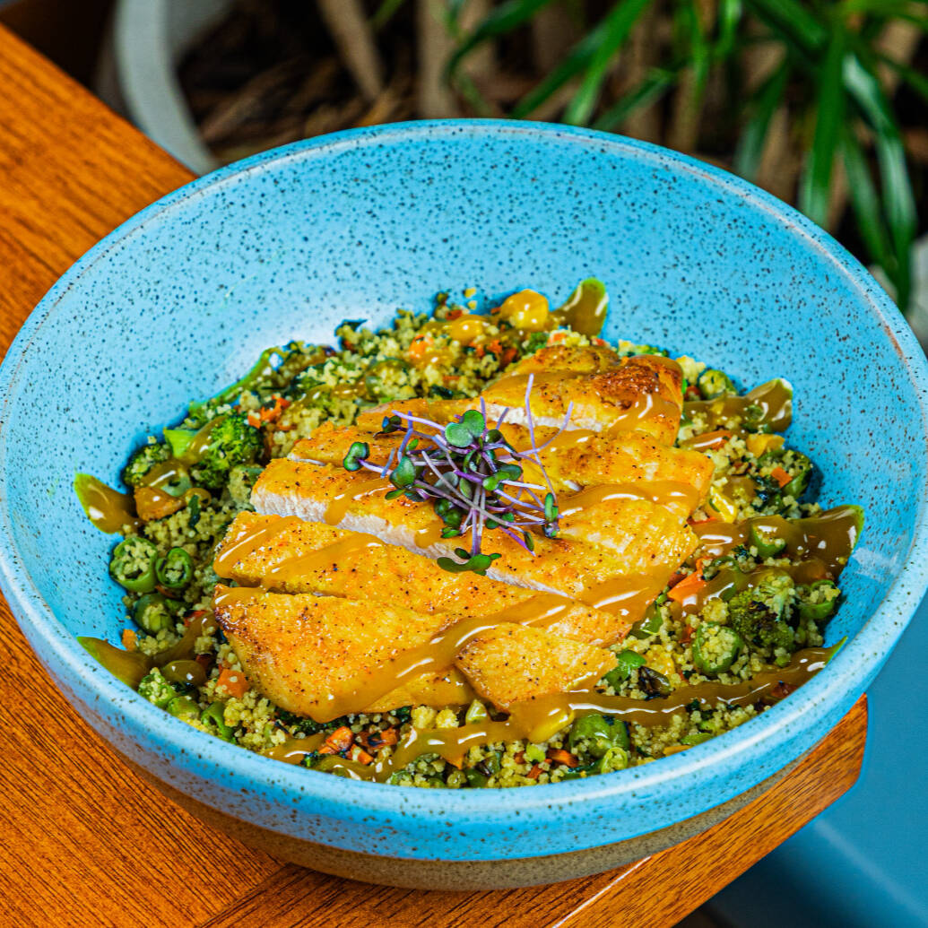 Frango grelhado, couscous temperadinho e salteado no azeite aromático de limão siciliano com mix de legumes (brocolis, milho, vagem e cenoura). Escolha o molho favorito (mostarda e melado, pesto ou teriyaki) para finalizar o bowl.