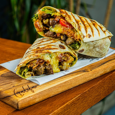 Angus (em cubos) salteados em molho shoyu, muçarela, tomate cereja, chips de batata doce, suave toque de molho mostarda e melado e mix de folhas, envoltos em wrap tradicional ou espinafre (dependendo da disponibilidade do Dia). *Prensamos para ficar ainda mais gostoso!