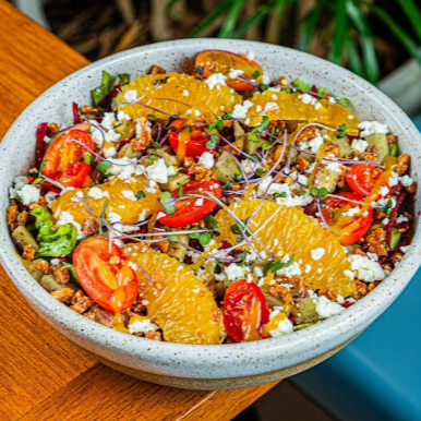 Mix de folhas, gomos de laranja, queijo de cabra, beterraba, tomate cereja, batata doce e crocante de nuts caramelizados. Sugestão de molho: mostarda e melado