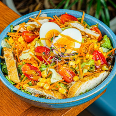 Mix de folhas, tirinhas de frango grelhado, creme de avocado, milho, tomate cereja, cenoura e ovo cozido. Sugestão de molho: pesto ou azeite com limão siciliano.
