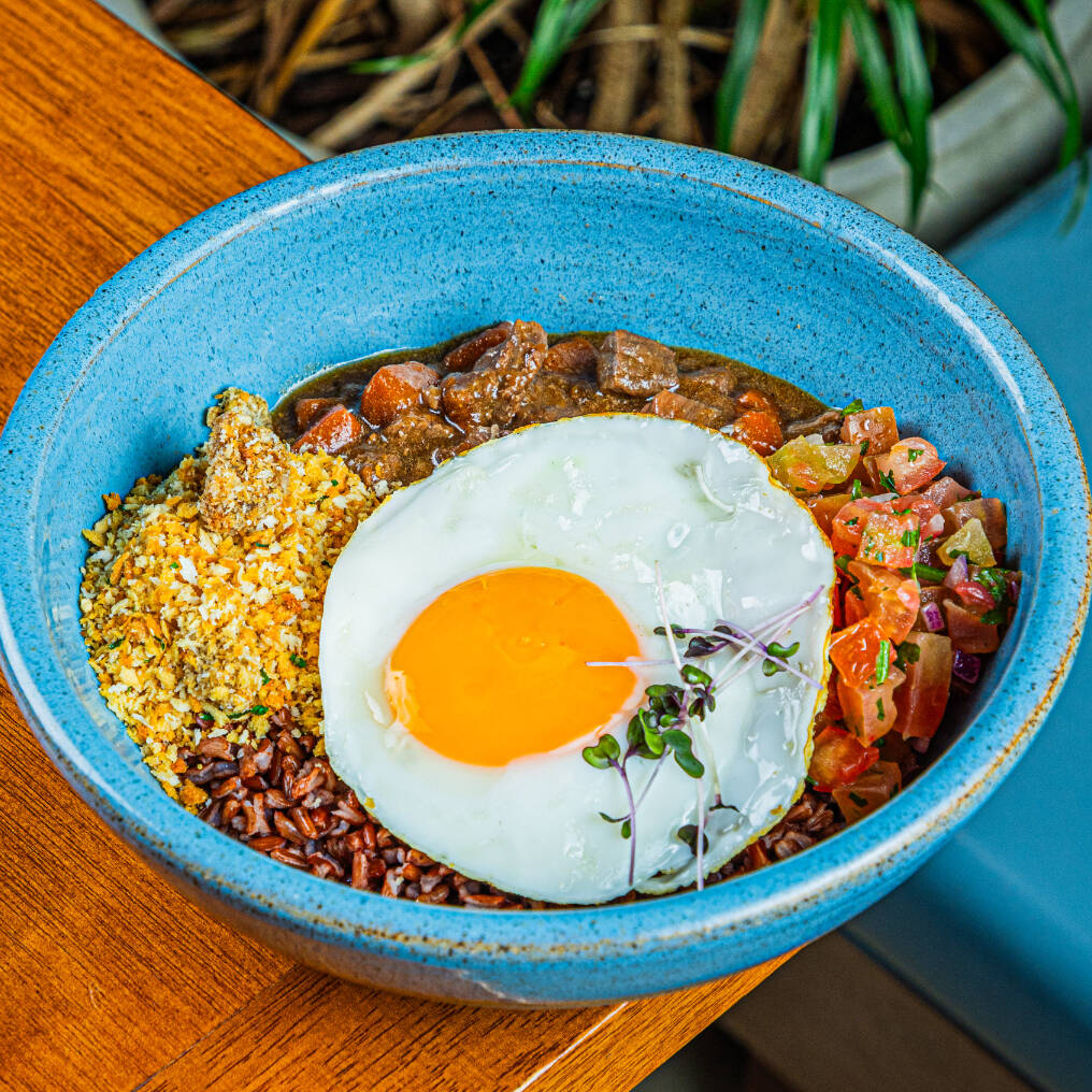 Picadinho de Angus com arroz vermelho, farofa crocante de banana, vinagrete e ovo frito estrelado. É delicioso pode apostar!!