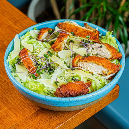 Mix de folhas (americana e romana), tiras de frango empanado, lascas de parmesão e molho caesar.