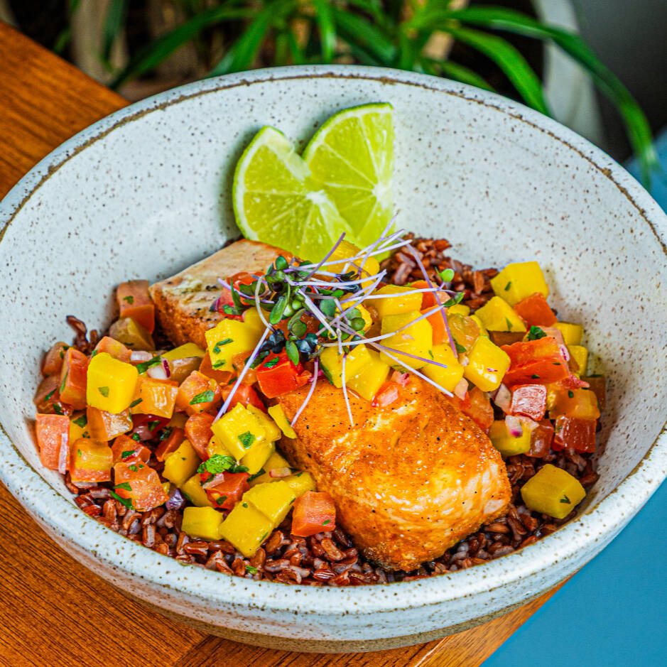Salmão grelhado, vinagrete de manga e arroz vermelho.