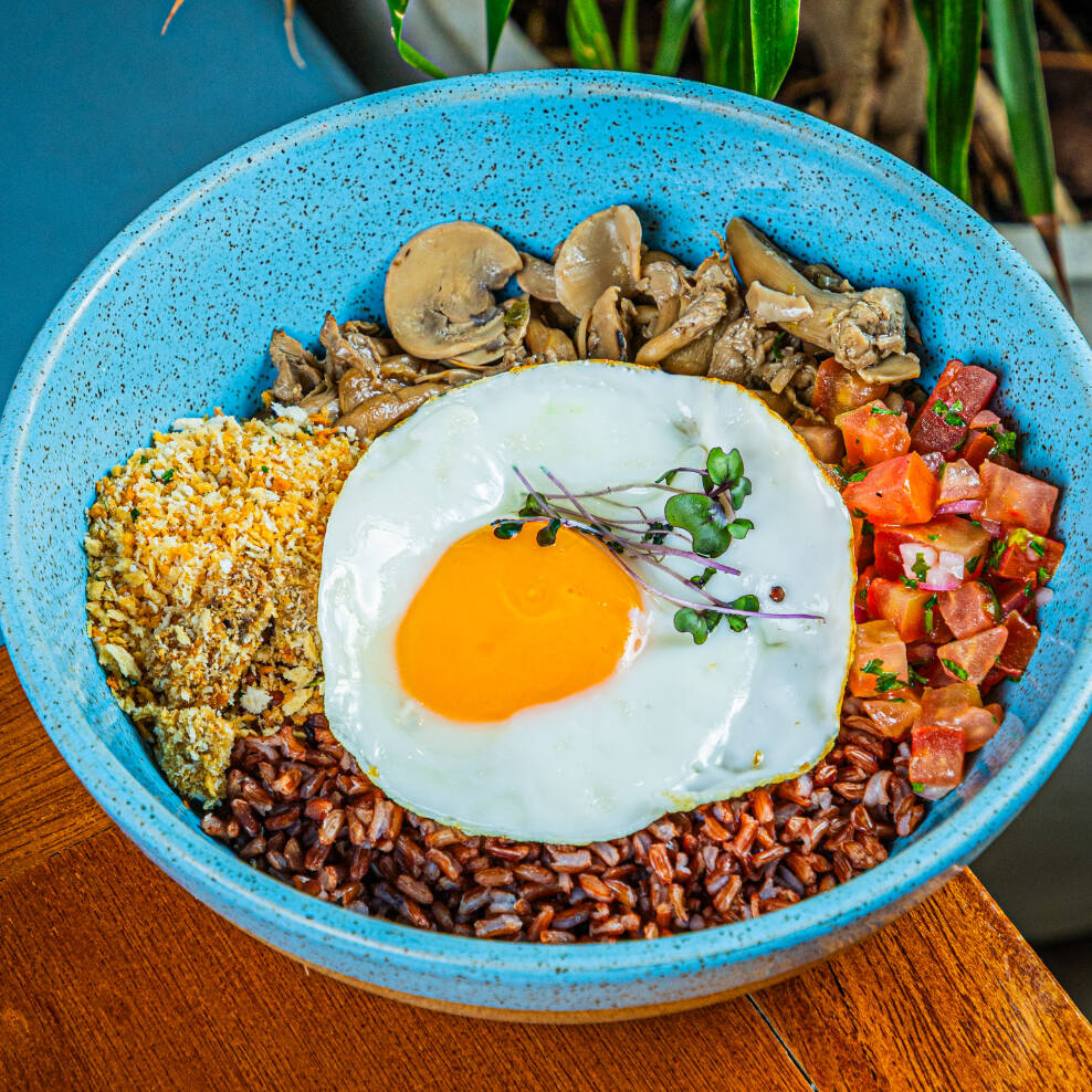 Picadinho de Cogumelos com arroz vermelho, farofa crocante de banana, vinagrete e ovo feito estrelado.