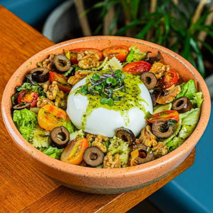 Mix de folhas, deliciosa burrata artesanal cremosa, macarrão gravatinha com pesto, azeitonas pretas, tomate cereja e nozes. Sugestão de molho: pesto ou azeite com limão siciliano.