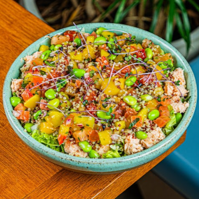 Mix de folhas, salmão grelhado e desfiado, quinoa, vinagrete de manga e edamame. Sugestão de molho: teriyaki