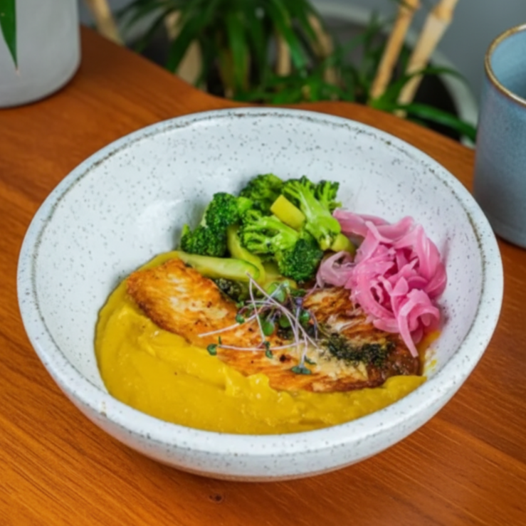 Filé de Saint Peter grelhado ao azeite de ervas, purê de mandioquinha, legumes salteados(abobrinha e brócolis) e picles de cebola roxa.