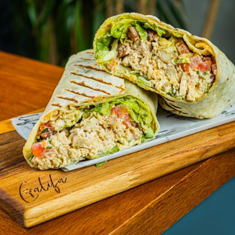 Frango grelhado com sour cream, creme de avocado, vinagrete e mix de folhas, envoltos em wrap tradicional ou de espinafre (dependendo da disponibilidade do Dia).