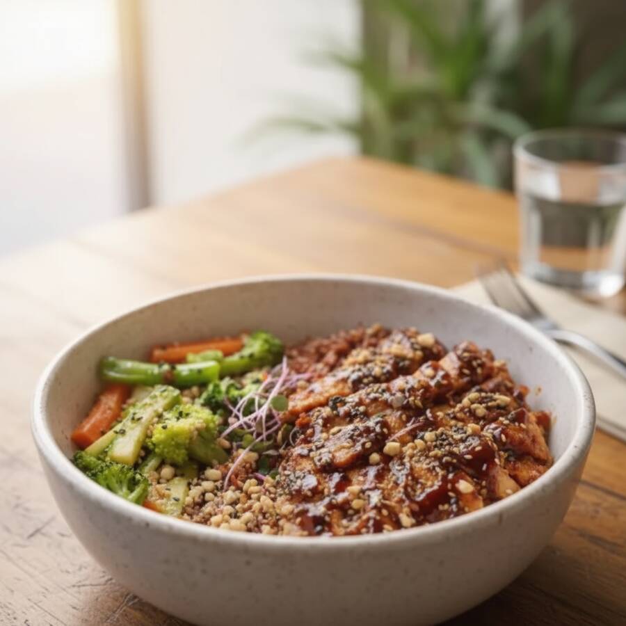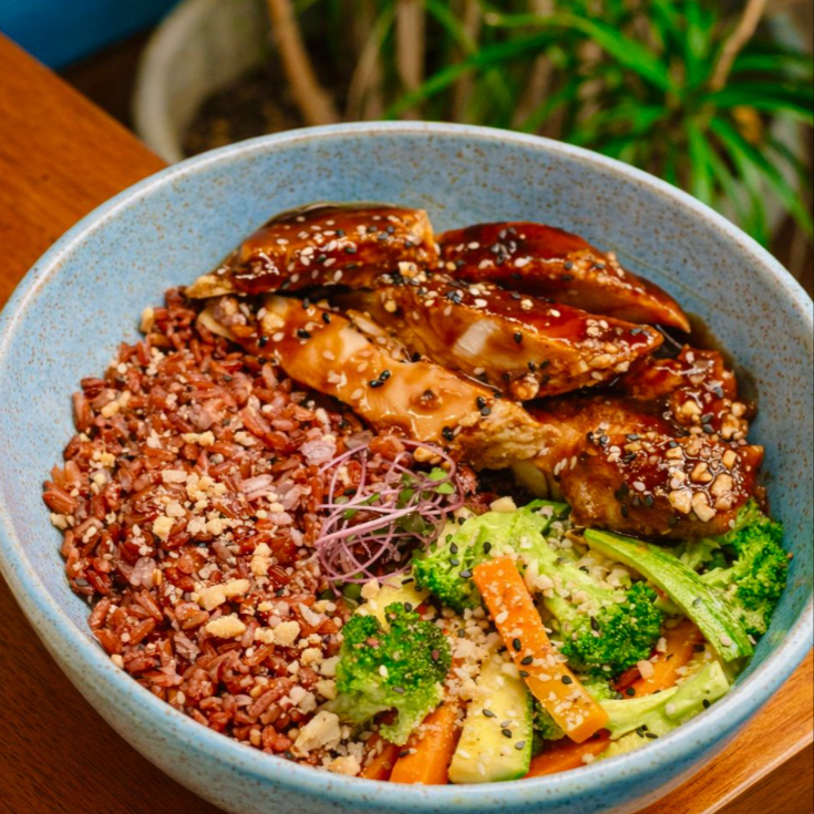 Tiras de frango grelhado salteadas no molho teriyaki, arroz vermelho e legumes da estação salteados. Para finalizar, um toque de gergelim e nuts crocantes.