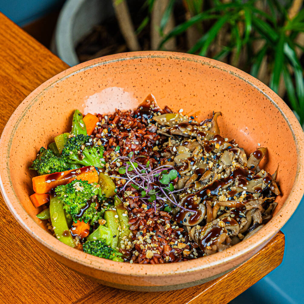 Mix de Cogumelos salteadas no molho teriyaki, arroz vermelho e legumes da estação salteados. Para finalizar, um toque de gergelin e nuts crocantes.