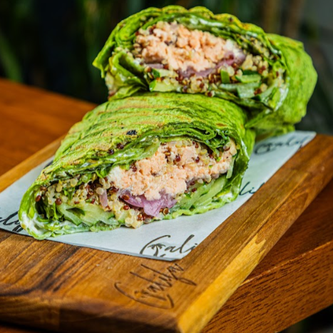 Salmão grelhado (desfiado), quinoa, sour cream, picles de cebola roxa, pepino e mix de folhas, envoltos em wrap de espinafre ou tradicional (dependendo da disponibilidade do Dia).