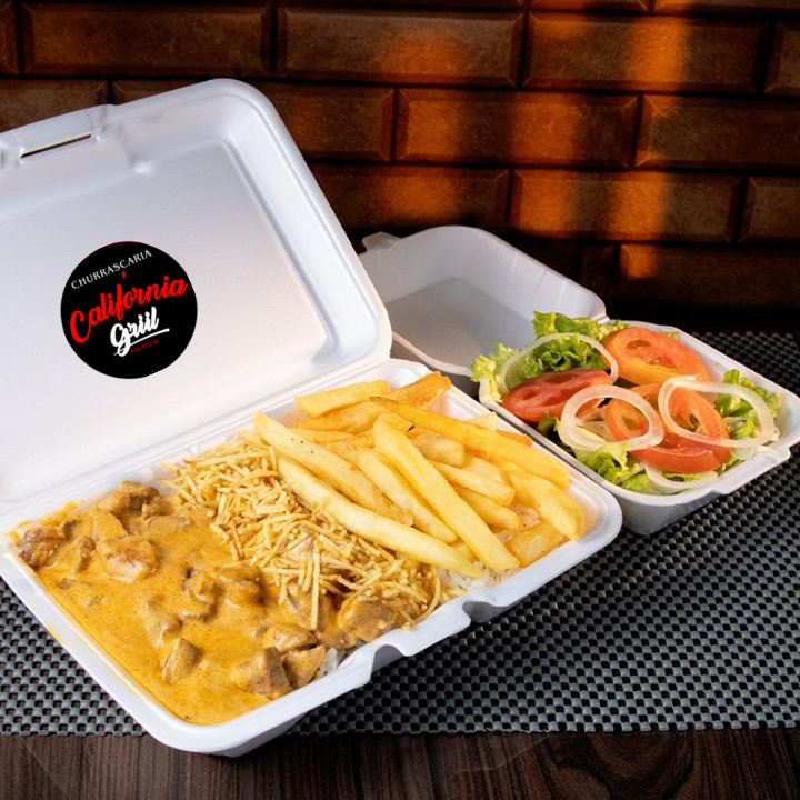 Uma deliciosa marmita acompanhada de um arroz branco soltinho, feijão temperado e batata frita sequinha e crocante.