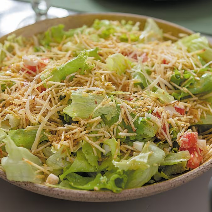 Alface, cenoura, tomate, queijo parmesão, batata palha e molho de mostarda e mel