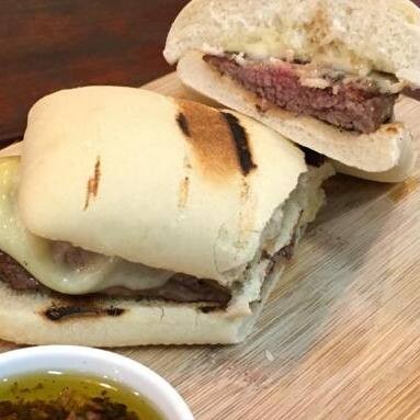 Sanduiche com a cara do Calle 54: pão ciabata, shoulder grelhado e queijo mozarela.