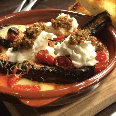 Um delicioso prato vegetariano! Berinjela assada regada a molho de tomate com queijo muçarela e burrata. Novidade deliciosa que serve até duas pessoas!