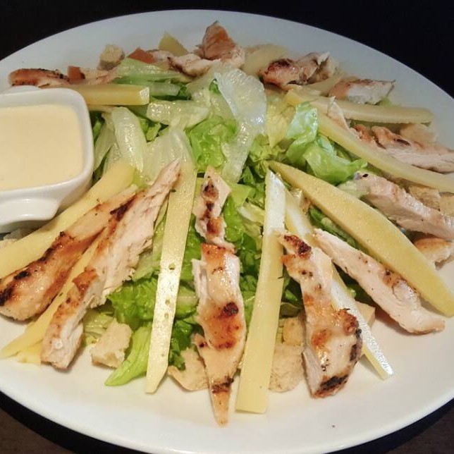 Salada de alface americana com croutons, frango grelhado, parmesão e molho Caesar