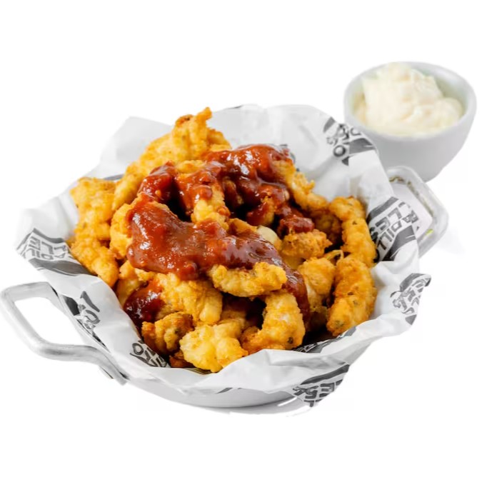 Deliciosos tiras de peitos de frango fritos com babecue e creme azedo.