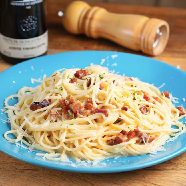 Massa tipo espaguete com molho à base de ovos, bacon e queijos.