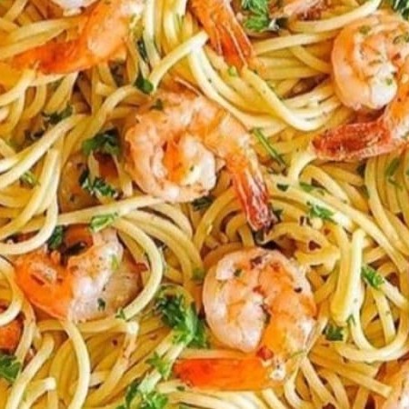 Delicioso spaghetti regado com azeite de oliva e manteiga acompanhado de pelo saboroso camarão, e com um toque de salsinha. Serve 4 pessoas. 2kg Com Coca-Cola 2l grátis