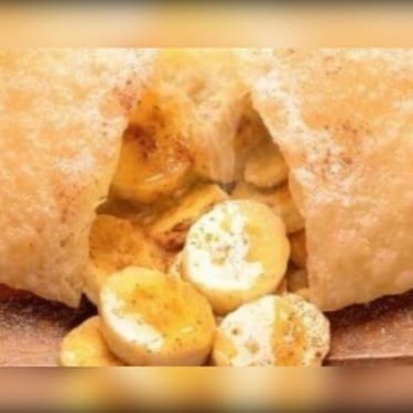 Bana fatiada, açucar e canela. Aproximadamente 18 centímetros.