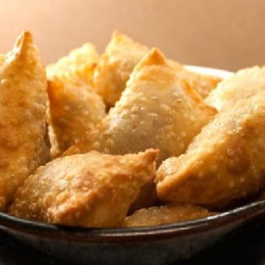Porção de mini pastéis (pizza/ queijo mussarela / calabreza com queijo). Aproximadamente 8 cm.