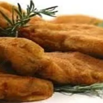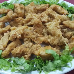 Peixe de primeira cuidadosamente cortado em pedaços pequenos, temperados a moda da casa, empanados com farinha de trigo de primeira e fritos à dorê.