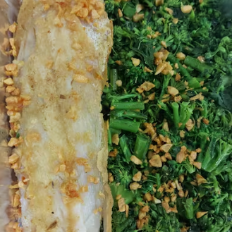 Dois filés de pescada branca, empanados em farinha de trigo de primeira e fritos à dorê em óleo vegetal. Porção acompanha brócolis e tudo coberto com delicioso alho frito no azeite.