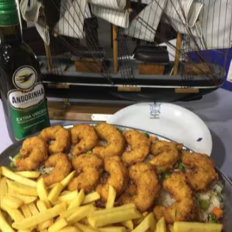 Camarões médios, caprichosamente empanados à milanesa com farinha de pão italiano, deitados no arroz à grega, cobertos com mussarela de primeira e depois gratinados na salamandra. Acompanha batatas fritas.