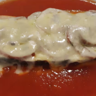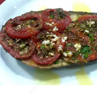 Berinjela cortada ao meio, assada com fatias de tomate, alho,salsa e oregano. Coberta com mussarela e gratinada na salamandra.