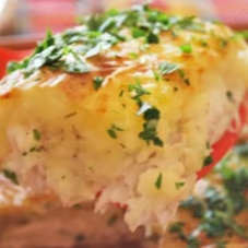 Lascas de legitimo salmão chileno, refogado com ervas finas e cuidadosamente “escondido” no purê de mandioquinha, coberto com faixa azul e posteriormente gratinado em salamandra. acompanha arroz, serve 2 pessoas.