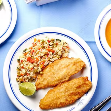 Dois filés de pescada branca, empanados em farinha de trigo de primeira e fritos à dorê em óleo vegetal. Porção acompanha delicioso arroz à grega.