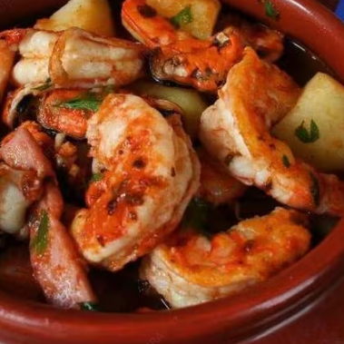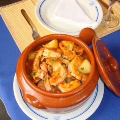 Delicioso ensopado de peixe e frutos do mar, no molho de tomate especialmente elaborado com creme de leite, lula, marisco, camarão sete barbas, vôngole, peixe, camarões médios e batatas. Acompanha arroz.