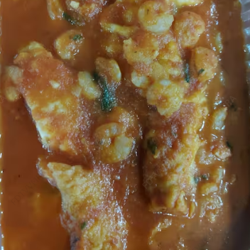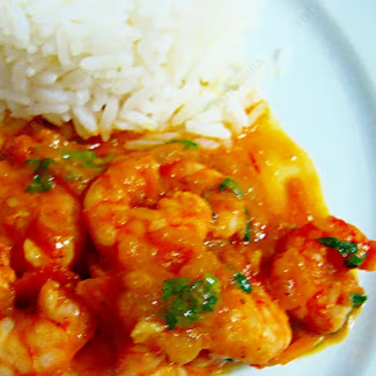 Camarões descascados na casa, cozidos e refogados no molho vermelho elaborado por nós, com leve pitada de pimenta. Acompanha arroz branco.