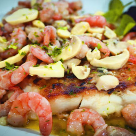 2 filés de pescada cambucu grelhados na chapa com azeite, cobertos com refogado de camarão 7 barbas , azeitona, champignon, alcaparras e batata. acompanha arroz branco