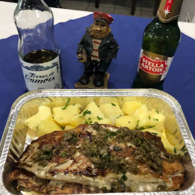 2 Filés de Anchova deliciosamente grelhados no azeite, cobertos com molho de alcaparras espanholas. Acompanha batatas Sautê