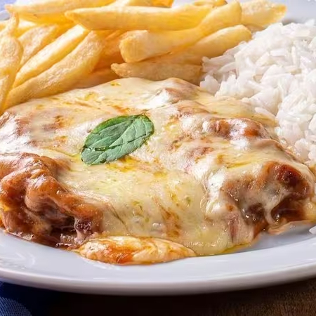 Um Bife de Contra Filé Suculento Regado de Muito Queijo, Molho Artesanal e muita Batata Frita + Arroz Soltinho. *Enviaremos a Parmegiana em uma Embalagem Separada