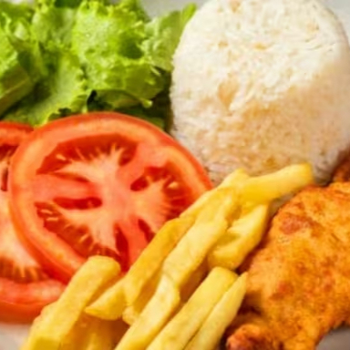 Um filé de Frango Com uma Casquinha Crocante e Saborosa por fora, Macio e Suculento por Dentro + Batata Frita + Arroz com Feijão no capricho e Salada Fresquinha.