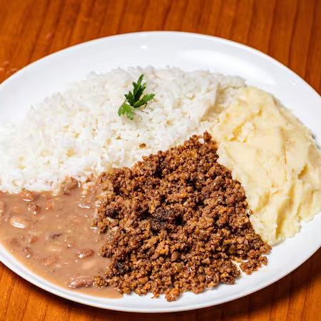 Bastante Carne Moída de Primeira Um purê Muito Cremoso Feito na Hora, um sabor de infância Acompanhado de Arroz soltinho e Feijão Fresquinho, a Marmita Perfeita está aqui. Pode Pedir sem medo.