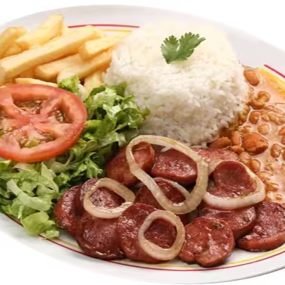 Muita Calabresa acebolada + Batata Frita Sequia e Crocante + Arroz Com feijão Fresquinho e Salada verde do Dia.