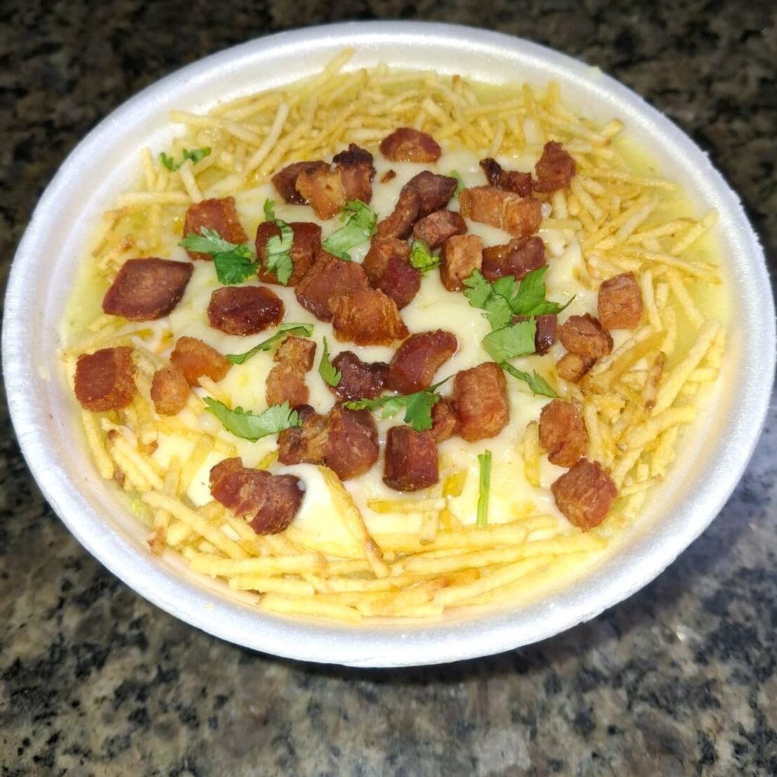saborosa batata recheadaDE STROGONOFF acompanhada com bacon, queijo,batata palha,cheddar e requeijão cremoso