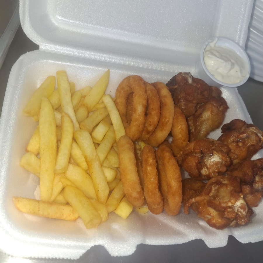 Porção com batatas super crocantes, onion rings e coxinha da asa, acompanha molho de alho