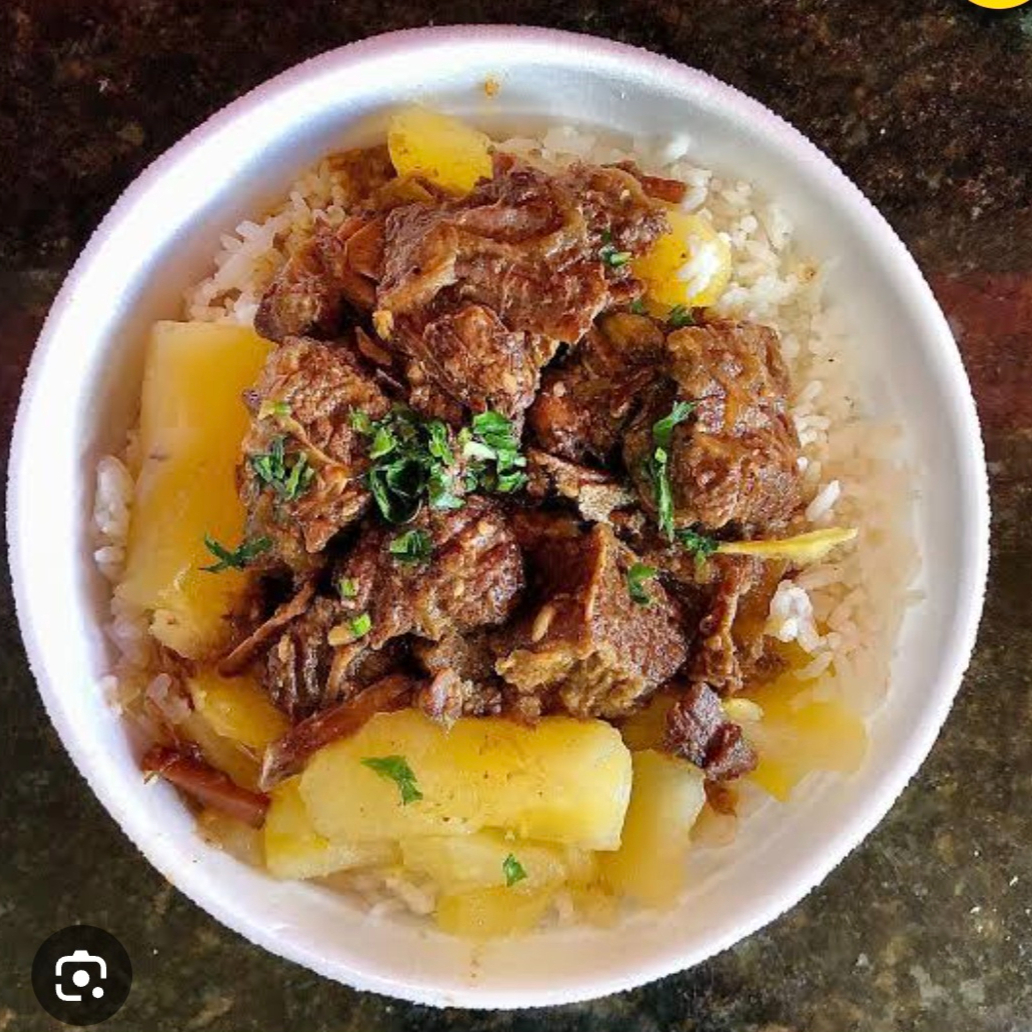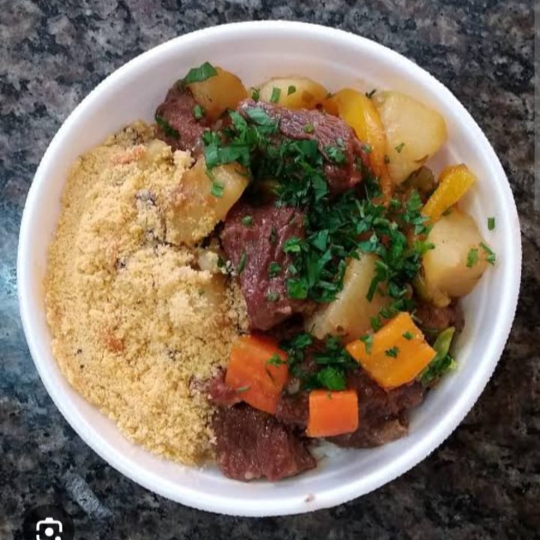 Saborosa marmitex de picadinho com batata cenoura , farofa temperada com bacon e calabresa, arroz soltinho branquinho e feijão com tempero caseiro