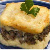 Refeição preparada com purê de batata, alho poró e carne moída. Com...